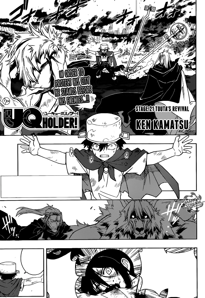 Touta Revives is the 21st chapter of the UQ Holder! manga. In this chapter, Ruki and Kuroumaru Tokisaka continue struggling against their opponents, however, Touta Konoe manages to get up, equipped with a new ability.