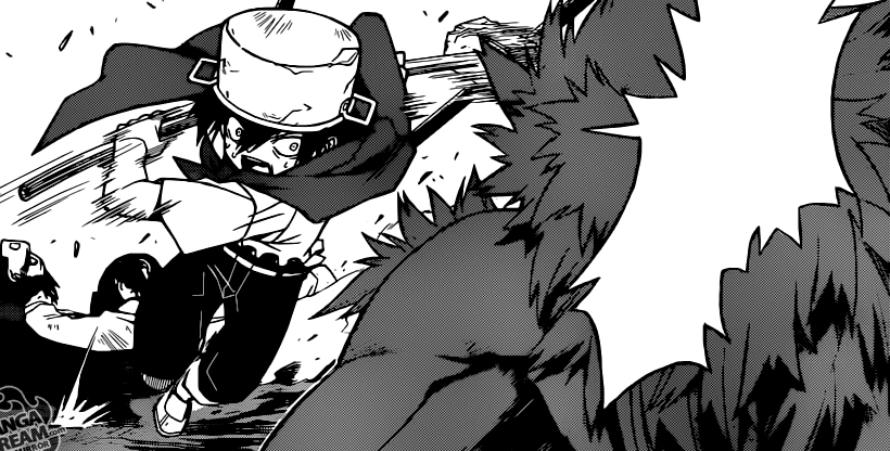Meanwhile, Ruki charges at Kaito, weilding a hammer. His attack is effortlessly blocked by the Werewolf, who praises the boy for his action while grabbing his body. Even though Kaito states that it'd be a waste to kill the boy, he continues squeezing his body, in spite of the boy's resistance and insults. Teary-eyed, Ruki questions the attackers' motive, however, Kaito simply replies that it's their job. Nagumo begins explaining that this land is not theirs, but it belongs to the people from top of the Heaven's Pillar. When he blames the current inhabitants of the land for social instability, Ruki argues that they're proper Japanese citizens, having been paying the taxes and taking care of the land. Nagumo replies that they'll receive some compensation for this, causing Ruki's question whether it is to make them shut up. Without any remorse, Kaito notes that it's their job, no matter how dirty it is.