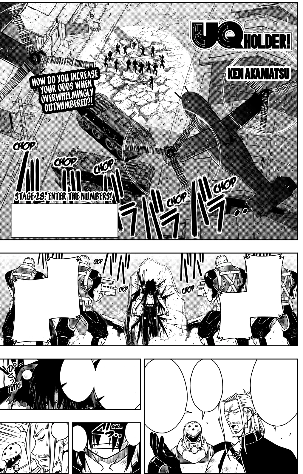 Enter the Numbers! is the 28th chapter of the UQ Holder! manga. In this chapter, Yukihime, Jinbei Shishido, Gengorou Makabe and Ikkuu Ameya arrive to assist Touta.